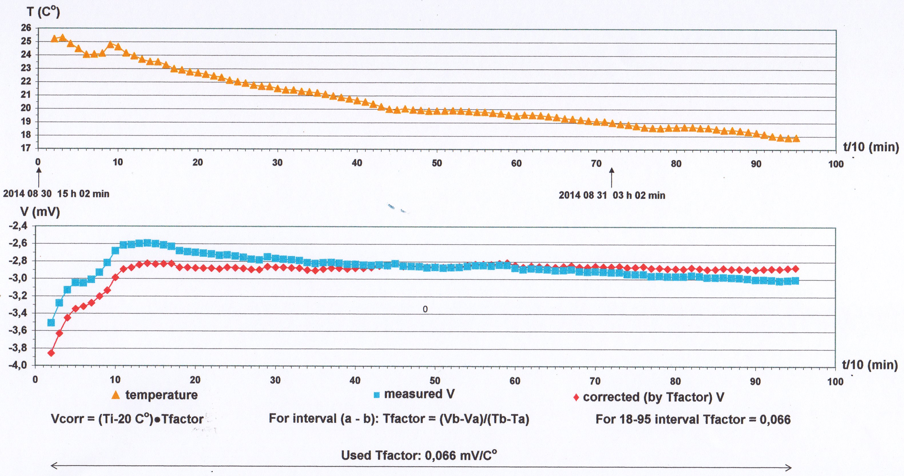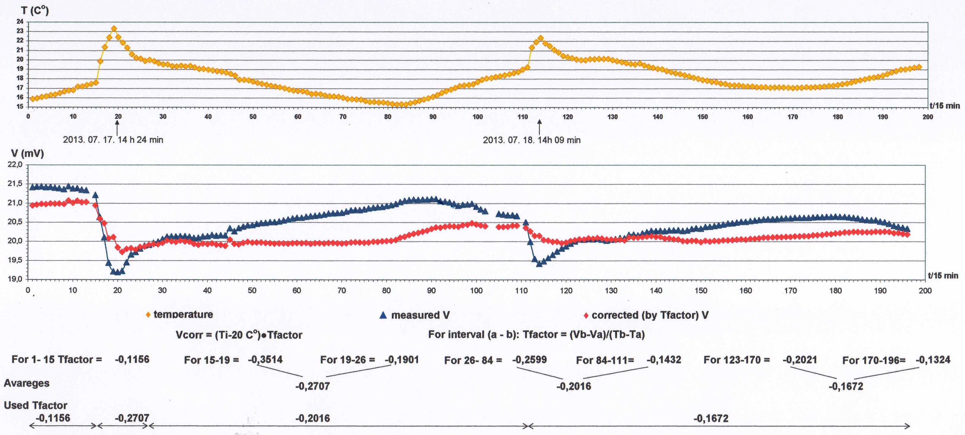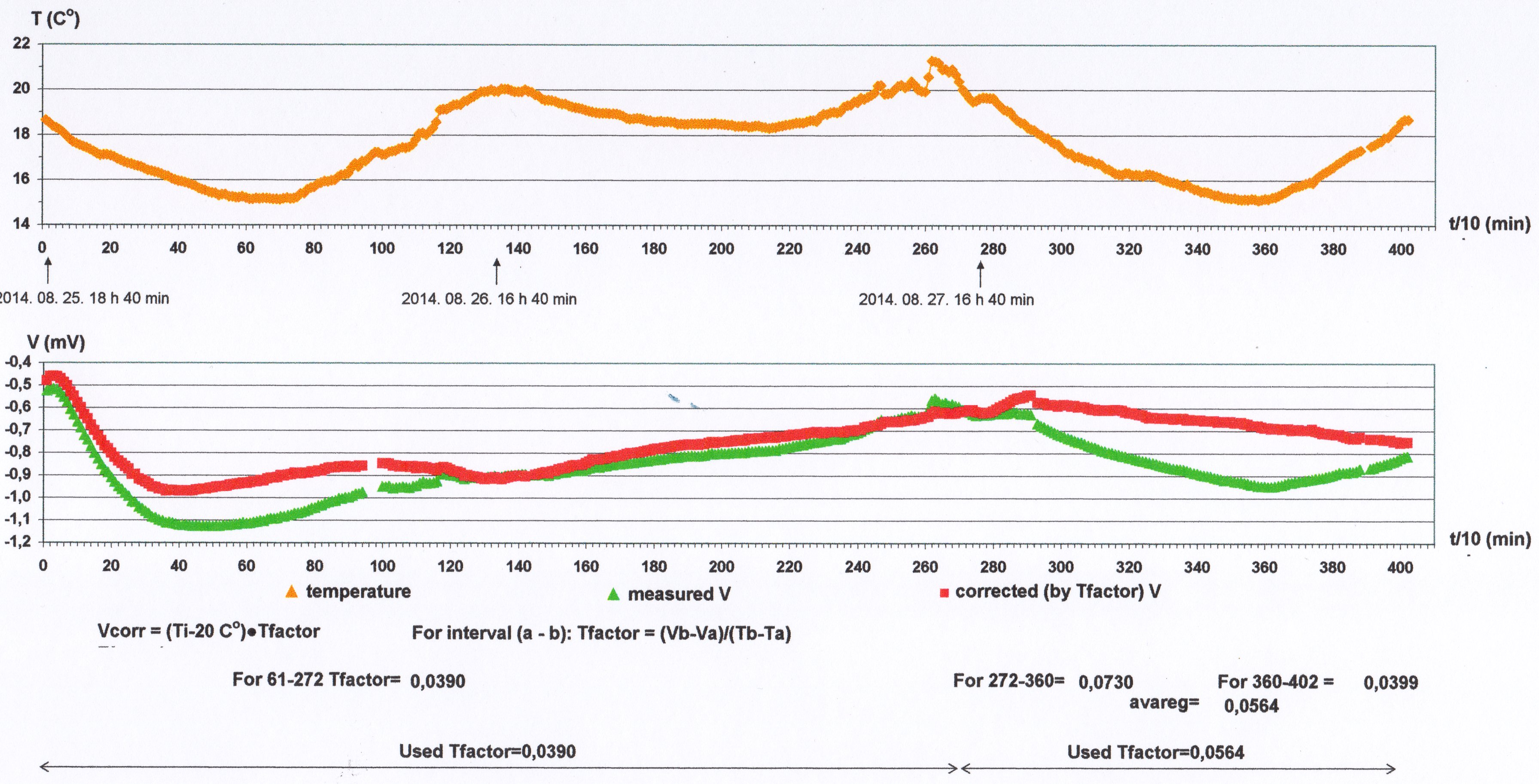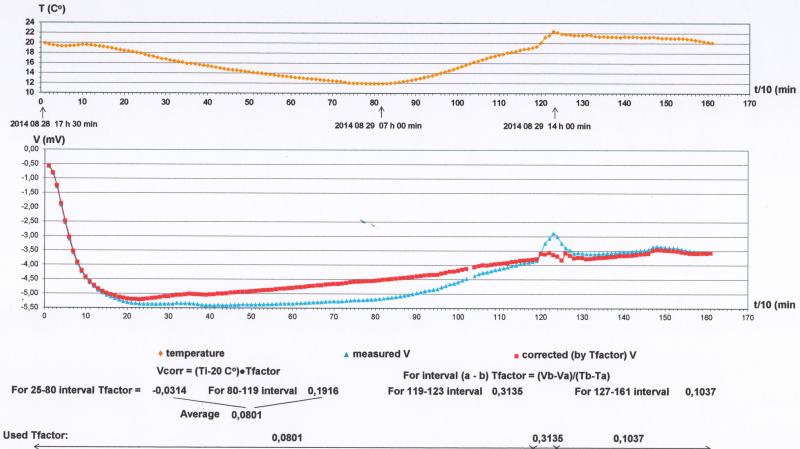 During the processing of the test measurements the Tfactor values usually were determined for each interval of time series separately but for such intervals what seemingly were not bothered by other disturbing effects (e.g. contact polarization). At such intervals one could detect between the temperature and the potential striking correlation or anti-correlation. In some cases on given intervals was used the average of Tfactors determined on two adjacent intervals.